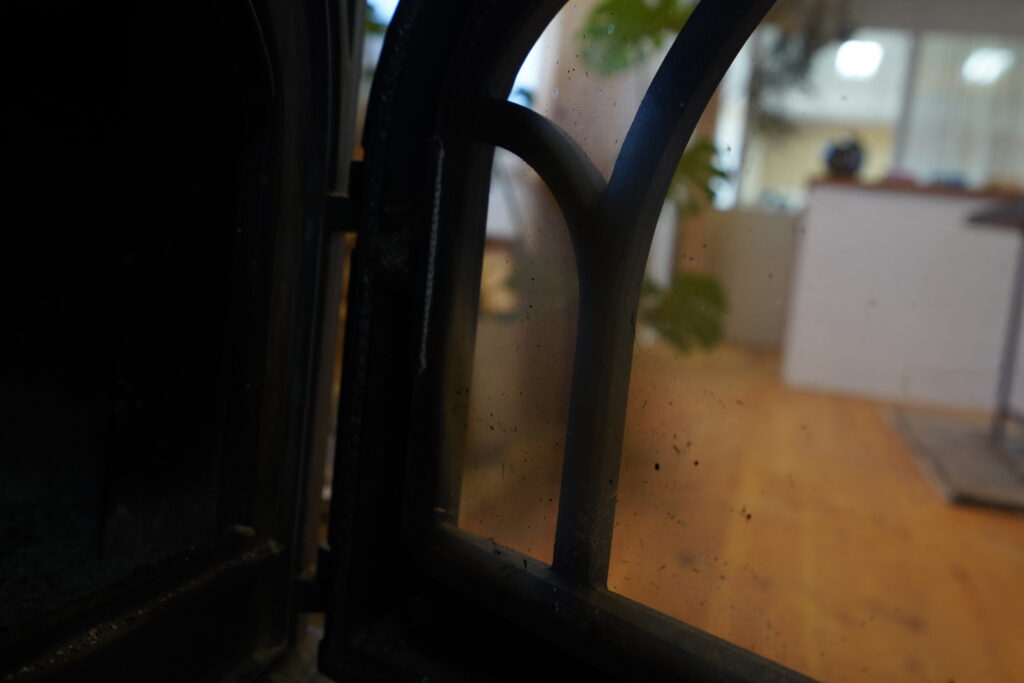 薪がはぜる様子を楽しむ「窓ガラス」。ここに煤(すす)がついていると、せっかくの火の癒やしが半減してしまいます。 専用のクリーナーもありますが、「湿らせた新聞紙にストーブの中の白い灰をちょっとつけてこする」だけでも驚くほどピカピカになります。
