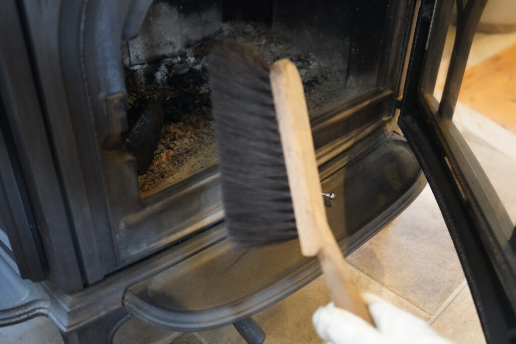 まずはストーブの中に溜まった灰の掃除から。 実は、薪ストーブの灰は少しだけ底に残しておくと、来シーズンの焚き始めに「火床」となって、ストーブの底を守り、燃焼効率を助けてくれる役割があります。
