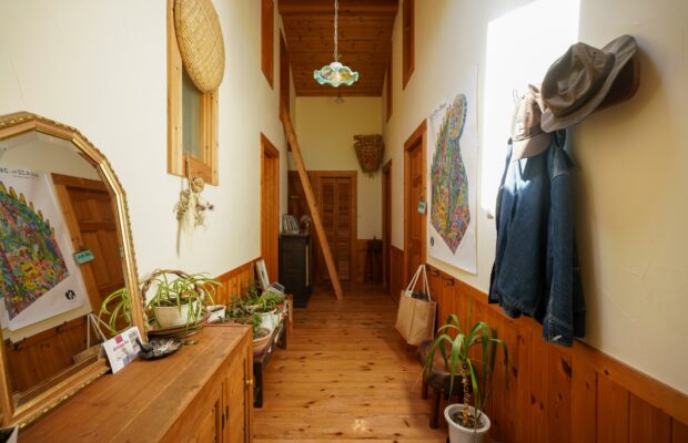 「どうぞ中へ」と奥様にご案内していただき、ステンドグラスがはめられた玄関ドアを開けると、明るい吹き抜けスペースが。上を見るとカラフルなドライフラワーが吊り下げられ、壁にはリース、観葉植物などが飾られています。右手をドアを開けるとリビングです。